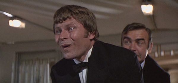 As long as the topic of butch characters has been brought up, let us get to the dual assassins Mr. Wint and Mr. Kidd. As I haven’t read the Ian Fleming novel in quite some time, I cannot for the life of me remember if they were originally portrayed as being this gay. I guess after using big Korean dudes with lethal bowler hats and then random guys in color-coded jumpsuits, the next logical step would be having two gay killers in your evil organization’s employ. However, as they never share any scenes with Blofeld, perhaps they are just killing for the sake of killing throughout the movie.