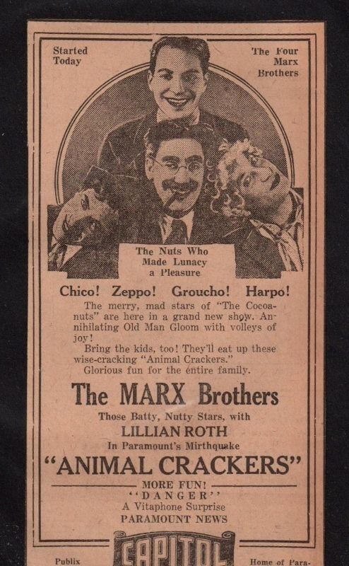 That extravaganza turned out to be the musical comedy Animal Crackers. Returning to book duties were Kaufman and Ryskind. This time the music would be handled by Bert Kalmar and Harry Ruby. (I wonder whatever became of that Berlin fellow. Since he never provided music to another Marx production, I can only imagine that he vanished into obscurity, never to be heard from again.) Even with the nightly stage demands of Animal Crackers, the Marxes concurrently filmed a version of The Cocoanuts for Paramount during the daylight hours. In 1929, the all-talking, all-singing comedy of The Cocoanuts wowed movie audiences who were thankful simply because they were getting tired of seeing Al Jolson in everything else. A film adaptation of Animal Crackers for Paramount followed in 1930. Afterwards, the Four Marx Brothers left for the greener hills and greener backs of Hollywood.